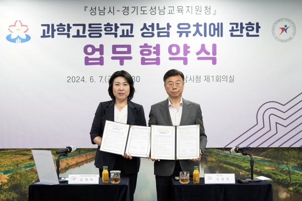 [광성일보] 성남시와 성남교육지원청은 6월 7일 특수목적고인 과학고등학교를 지역에 유치하기 위해 업무 협약을 체결했다.협약식은 이날 오전 10시 30분 시청 4층 제1회의실에서 신상진 성남시장과 오찬숙 교육장 등이 참석한 가운데 진행됐다.주요 협약 내용은 과학고등학교 유치를 위한 행정·재정 분야의 협력, 필요한 정보 공유, 협력 네트워크 구축 등이다.