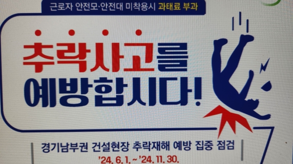 지난 3년간 성남지청 관내에서는 건설현장에서 총 37명이 산업재해로 인하여 사망하였으며, 떨어짐 사고가 57.9%(38명)로 가장 많이 발생하였다.특히, 떨어짐 사고는 개구부와 단부에서 주로 발생하였는데 임시 시설물이라는 이유로 현장에서 안전난간이나 덮개 또는 작업발판이 설치가 되어 있지 않았으며, 근로자 또한 안전모나 안전대를 착용하지 않아 사망하는 경우가 대부분이었다.양승철 지청장은 “안전시설 관리 부족과 안전모, 안전대 등 개인 보호구 착용 소홀로 인한 추락, 넘어짐 등 충분히 예방 가능한 사고가 집중적으로 발생되고 있다.”라며,