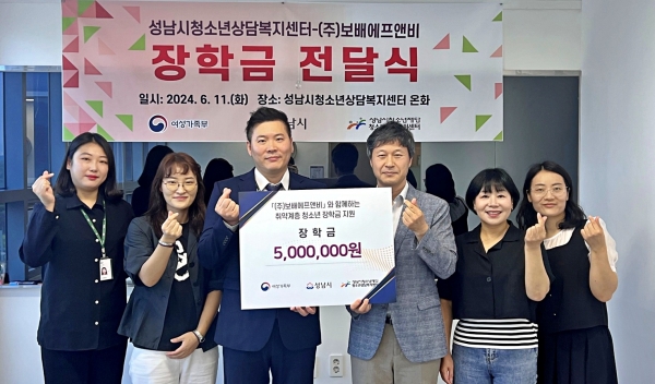 ㈜보배에프앤비는 성남시 위기 청소년 지원을 위해 성남시청소년재단 성남시청소년상담복지센터(소장 임낙선)에 장학금 500만원을 전달했다.