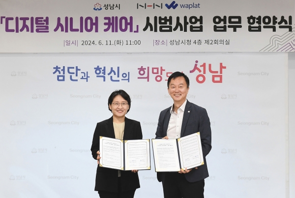 [광성일보] 성남시는 NHN 자회사인 와플랫㈜와 손잡고 스마트폰 앱으로 65세 이상 노인에 돌봄, 안부, 소통, 건강, 여가, 편의 서비스를 제공하는 사업을 편다.시는 6월 11일 오전 11시 시청 4층 제2회의실에서 이진찬 성남부시장과 황선영 와플랫 대표이사, 노인종합복지관 관장 등이 참석한 가운데 ‘디지털 시니어케어 시범사업 시행을 위한 업무협약’을 했다.협약에 따라 와플랫은 자체 개발한 노인 돌봄 플랫폼 ‘와플랫 앱’을 성남시에 7월 8일부터 내년 3월 7일까지 8개월간 무상 제공한다.시는 노인맞춤돌봄서비스 대상자 중 스마트폰 활용이 가능한 65세 이상 어르신 100명을 선정해 해당 앱으로 관련 서비스를 시행한다.