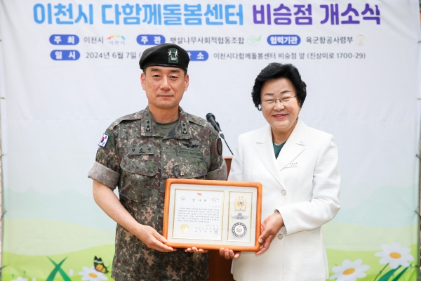 [광성일보] 이천시(시장 김경희)는 지난 7일 전국 최초 육군 관사 아파트 내 다함께돌봄센터(비승점)를 설치하고, 두 번째 개소식을 개최하며 운영 시작을 알렸다.이날 개소식에는 김경희 이천시장, 양윤석 항공사령부 사령관 및 군 관계자, 이천시의회 박명서 의원, 송옥란 의원, 단월초등학교장, 진가초등학교장과 황인재 중리동장을 비롯한 중리동 사회단체 대표와 대포동 주민이 참석한 가운데 다함께돌봄센터 비승점 개소를 축하했다.