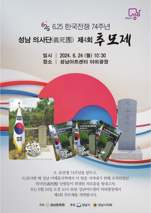 [광성일보] 성남문화원(원장 김대진)은 6.25전쟁 74주년을 앞두고. 6.25사변 때 성남지역에서 이 땅을 지켜내기 위해 조직되었던 의사단(義死團) 단원들이 희생된 의로움을 빛내고자, 오는 6월 24일 오전 10시 30분 성남아트센터 야외광장(주차장)에서 제4회 추모제를 개최한다. 이날 추모제는 식전행사로 성남시립국악단의 추모 연주와 이주희 연극배우의 추모 시낭송 ‘넋은 별이 되고’를 시작으로, 추모식에서는 ‘경과보고’, 김대진 원장의 ‘개회사’, 방영기 이무술집터다지는소리보존회 이사장의 ‘제문 봉독’, 참석 내빈 ‘추모사’, K-문화독립군 듀오아임 · 춤자이예술단 콜라보 공연 비나리 ‘해후’, 벨칸토콰이어 ‘비목’, ‘유월 애가’ 중창, ‘헌화 분향’, 마지막으로 참석자 모두 ‘6.25 노래 제창’ 순으로 이어진다.
