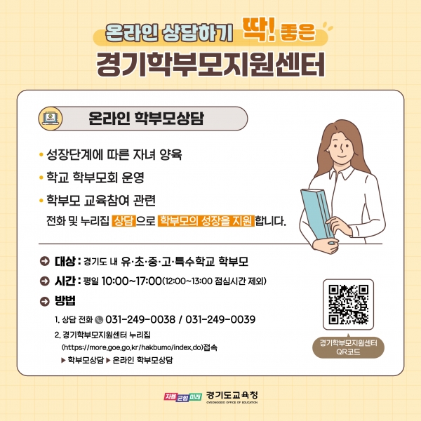 도교육청 홍정표 인재개발국장은 “아이가 태어나 제일 먼저 만나는 선생님은 부모님이고, 부모님이 마음이 바르게 서야 자녀도 바르게 성장할 수 있다”면서 “자녀 양육에 따른 마음 회복과 학교 학부모회 활동에 궁금한 점이 있으시다면 경기학부모지원센터와 상담하며 도움을 받으시길 바란다”고 말했다.한편 경기학부모지원센터는 학부모상담 외에도 ▲지역으로 찾아가는 온품 학부모교육 ▲학교 학부모회 운영지원 ▲학교운영위원회 구성 및 운영지원 등 학부모 역량 강화와 참여 활성화를 위해 다양한 노력을 기울이고 있다.