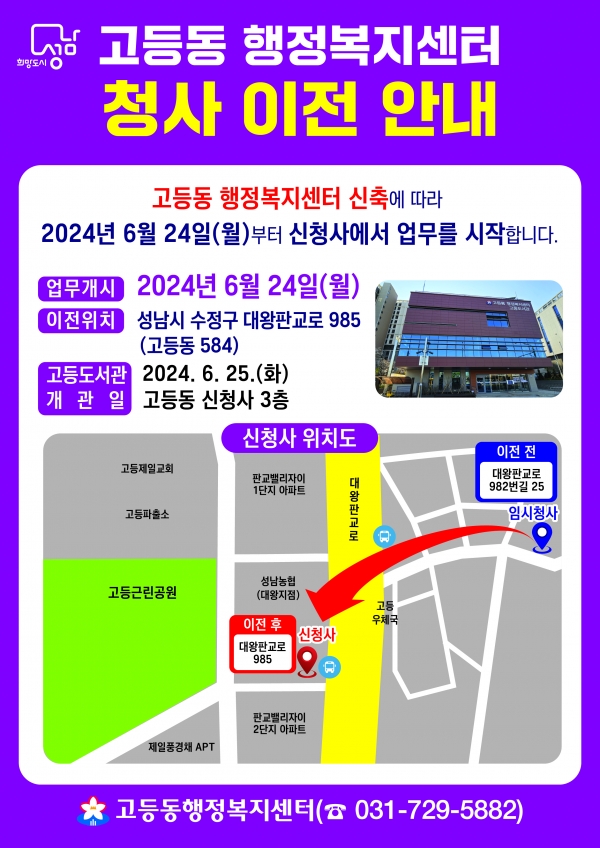 성남시 수정구 고등동 행정복지센터가 6월 24일부터 신청사(수정구 대왕판교로 985)에서 업무를 개시한다.