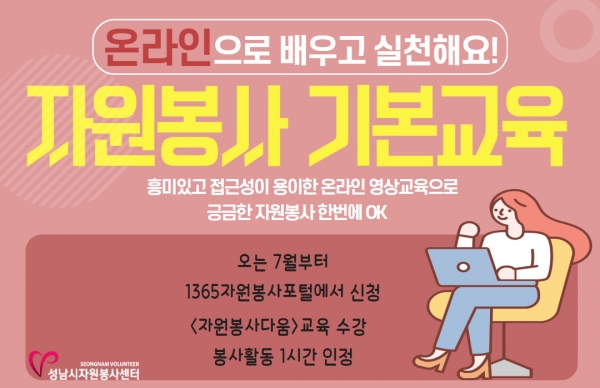 성남시자원봉사센터는 오는 7월부터 생업 등의 이유로 오프라인 교육 참여가 힘든 봉사자들을 위하여 온라인 교육과정을 신설, 오프라인 교육과 병행해서 운영한다고 26일 밝혔다. 온라인 교육이수자도 오프라인 교육 이수자와 동일하게 교육 이수가 인정되며 더불어 봉사활동 1시간도 함께 인정된다. 교육신청은 1365자원봉사포털에 공지된 <자원봉사 기본교육 온라인과정> 신청을 통해 가능하다. 신청 후 안내에 따라 경기도자원봉사센터의 온라인교육플랫폼인 <자원봉사다움>에서 지정 과목 가운데 1~2개 콘텐츠 선택해 수강하면 된다. 수강을 마치면 관리자가 주 단위로 수강현황을 확인, 개인별 교육 이수를 확인할 수 있다. 이수후 수강생은 개인 필요에 따라 이수증을 출력할 수 있다.