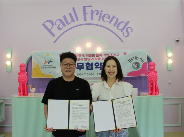 성남시청소년재단 수정청소년수련관(관장 변호용)과 반려견 복합공간 폴 프렌즈(대표 이지안)는 지난 3일 청소년의 올바른 반려동물 문화 조성과 사회정서 발달 지원을 위한 업무협약을 체결했다.