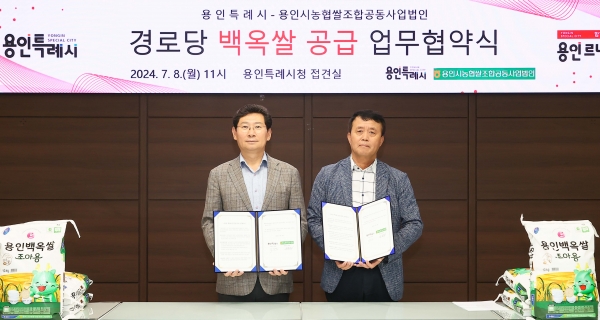시는 어르신들에게는 고품질의 좋은 쌀로 건강한 식사를 하실 수 있도록 하고, 관내 쌀 재배 농가에는 소득 증대에 도움을 주려는 취지로 이 협약을 체결했다.이에 따라 지금까지 정부 양곡미(나랏미)가 공급됐던 지역 내 850여 곳 경로당에는 이달부터 용인에서 생산되는 ‘백옥쌀’이 지원된다.매년 경로당 850여 곳에 공급하는 쌀은 20kg 기준 1만 200포대로 200여 톤에 달하기 때문에 백옥쌀 소비 증가로 농가에는 소득증대 효과가 발생하게 된다.이상일 시장은 “용인특례시의 대표 농산물인 백옥쌀을 어르신 복지 증진을 위해 제공하는 매우 뜻깊은 협약을 맺게 되어 보람을 느낀다”라며 “어르신들에게 고품질 백옥쌀을 제공함에 따라 백옥쌀 소비도 증가해 농가에도 큰 보탬이 될 것으로 기대한다”고 말했다