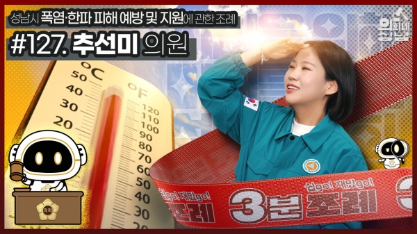 [광성일보] 성남시의회는 ‘3분 조례-추선미 의원 편’ 영상을 시의회 공식 SNS에 게시했다.이번에 소개된 조례는 추선미 의원 등 15명이 발의한 ‘성남시 폭염·한파 피해 예방 및 지원에 관한 조례’다.