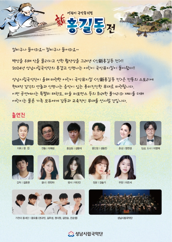 [광성일보] 성남시립국악단은 어린이를 위한 가족 뮤지컬 ‘홍길동 전’을 2024년 7월 18일(목) ~ 7월 22일(일)까지 매회 오전 11시 나누어 총 4회 공연을 한다.양반 아버지와 노비 출신인 어머니 아들로 홍길동은 태어난다.어머니가 노비 출신이란 이유로 홍길동은 어려서부터 재주는 많지만 많은 차별을 받으며 살아간다.홍길동은 집을 떠나 도적 무리를 만나고 두목이 되어 활빈당을 만든다.