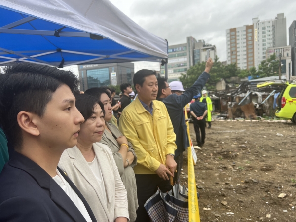 [광성일보] 성남시의회 더불어민주당협의회 대표단은 오후 2시40분께 성남시 중원구 성남동 성호시장 도시개발구역 내 건물 철거작업 중 붕괴사고가 발생한 현장에 방문했다. 이 사고로 현장에 있던 40대 근로자 A씨가 매몰되어 사망했다.이준배 대표의원은 “이번 사고로 안타깝게 목숨을 잃은 근로자의 명복을 빌며, 유가족분들께 깊은 애도의 말씀을 드린다.”면서, “사고 경위와 원인에 대해 명명백백히 조사할 것을 요청한다.”라고 전했다.