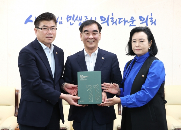 [광성일보] 경기도의회 의정정책추진단(공동단장 윤태길·정윤경, 이하 추진단)이 지난 2년의 의정정책 발굴활동과 추진성과를 다룬 ‘제11대 경기도의회 전반기 의정정책백서’를 16일 의장 접견실에서 염종현 의장에게 전달했다.백서를 전달받은 염종현 의장은 “이번 백서는 지방자치와 지방의회의 새로운 역사가 기록된 소중한 사료”라며 “백서에 담긴 소중한 ‘정책의 목소리’가 도의원께는 의정 나침반이, 도민께는 희망의 이야기가 되길 소망한다”라고 말했다.의정정책추진단은 의회에서 자체 구성(`22.11.1)한 의정지원 조직으로, 지역·민생·교육 현안을 제도화해 정책개발을 활성화하는 데 주력해 왔다. 출범 이후, 156명의 도의원과 도민의 염원을 담은 지역현안 4,101건을 발굴하고 그중 681건의 중점정책을 도출하는 성과를 거뒀다.