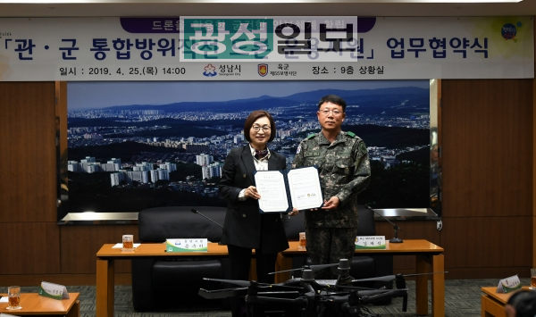 시는 4월 25일 오후 2시 시청 9층 상황실에서 성남시 통합방위협의회 의장인 은수미 성남시장과 김재석 육군 제55보병사단 소장 등이 참석한 가운데‘관·군 통합방위작전 드론 운용을 위한 협약식’을 했다.협약에 따라 성남시는 55사단에 드론 활용 기술을 지원한다.