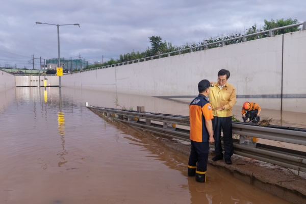 [광성일보] 김동연 경기도지사는 오늘(18일) 저녁 집중호우로 침수된 경기 평택 세교동 세교 지하차도를 찾아 복구 현황을 살펴보고 관계자들을 격려했다.도에 따르면 이날 평택시에는 오전 3시께부터 오전 8시께까지 평균 누적 강우량 67.76㎜를 기록할 만큼 많은 비가 내렸다.경기도 재난안전대책본부와 평택시는 이날 오전 통복동 6통과 7통 주민들에게 긴급대피 명령을 내리고 원평노을 지하차도, 세교 지하차도, 은실 지하차도, 서정 지하차도, 비전 지하차도를 통제했다. 신속한 통제 조치로 이들 지역에는 인명피해가 발생하지 않았다.