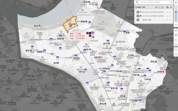 [광성일보] 송파구(구청장 서강석)가 관내 공공시설 현황과 기부채납 발생 예정지 등을 한눈에 지도로 파악할 수 있는 통합 DB를 구축하고, 오는 7월 말부터 용도 검토 등 행정실무에 활용한다고 알렸다.최근 관내 재개발·재건축 사업이 활기를 띠면서 기부채납 예정 시설도 함께 급증하고 있다. 새 공공시설의 쓰임새를 합리적으로 결정해야 하는 행정의 역할이 강조되고 있지만, 시설현황을 관리하는 부서가 제각각 달라서 용도 결정 전 정보의 취합과 분석이 현실적으로 어려웠다.