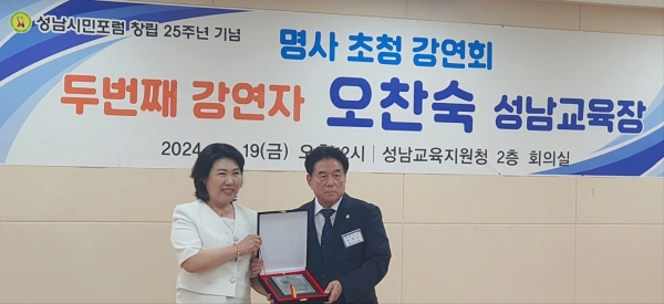 마지막으로 오 교육장은 “학생 맞춤 교육을 위해 다양한 교육과정이 운영되도록 최선을 다하겠다.”는 의지를 강조하며, 강연회의 마무리로 임태희 경기도교육감이 주창하는 “변화, 기회, 도전하는 성남시 교육정책을 이끌겠다.”고 말했다. 한편 이날 강연회는 성남시민포럼 2024 연중사업의 일환으로 지난 6월 홍진영 성남소방서장의 첫 번째 강연회에 이은 두 번째 강연회였다.이경식 상임대표는 인사와 함께 ‘우리가 꿈꾸는 미래, 함께하는 성남교육’으로 성남시 교육정책을 이끌어가는 오찬숙 교육장께 시민포럼 회원들의 뜻을 담은 감사패를 전달했고, 김대진 한국문화원연합회장 겸 성남문화원장이 참석해서 축사를 했다.