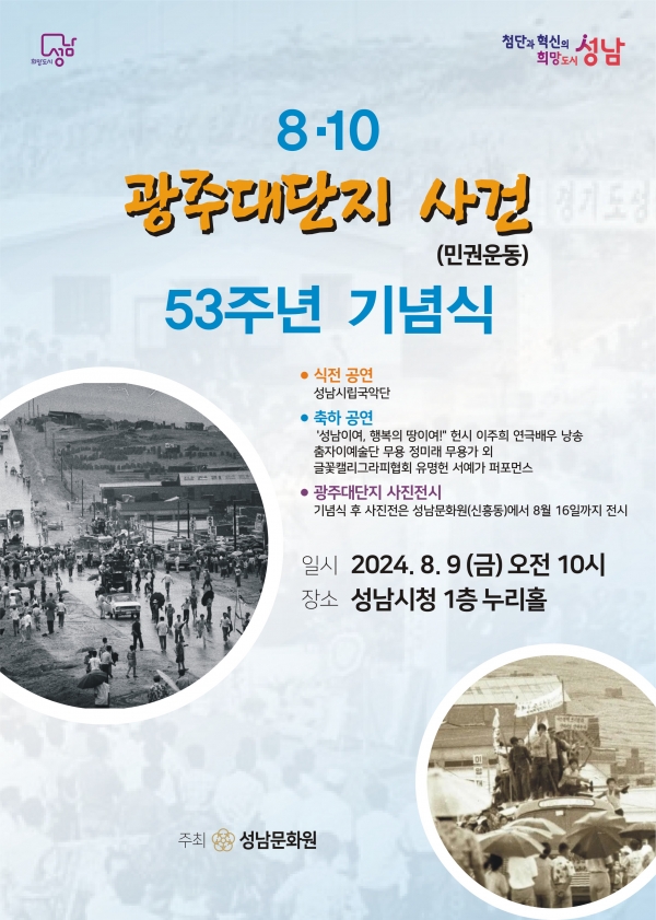 [광성일보] 성남문화원(원장 김대진, 한국문화원연합회장)은 8·10 광주대단지 사건 53주년을 맞아 오는 8월 9일(금) 오전 10시, 시청 누리홀(1층 로비)에서 기념식을 개최한다. 이날 행사는 식전공연인 성남시립국악단의 연주를 비롯하여, 기념사, 축사와 축하공연인 이주희 성남연극협회 회장의 ‘성남이여, 행복의 땅이여!’ 헌시 낭송과 춤자이예술단의 무용, 글꽃캘리그라피협회 유명헌 서예가의 콜라보 퍼포먼스 순으로 진행되며, 광주대단지 관련 사진전도 마련된다. (기념식 후 사진전은 신흥동 성남문화원에서 8월 16일까지 계속된다.) 8·10 광주대단지 사건은 1968년에 수립된 서울시의 무허가 주택 철거계획에 따라 경기도 광주군 중부면(현 성남시 수정·중원구) 일대로 강제 이주당한 주민 5만여 명이 최소한의 생계 수단 마련과 세금 등에 대한 조치를 요구하며 1971년 8월 10일 정부를 상대로 벌인 대규모 시위이다.