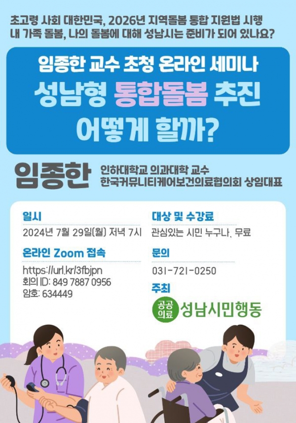 김용진 공동대표는 인사말을 통해 “돌봄 불평등 문제는 건강 불평등과 함께 성남 지역사회가 당면한 가장 큰 도전 과제이자 지속가능성은 물론 미래의 시민의 삶을 좌우할 만큼 중대한 정책 과제”라고 지적하고, 주요 나라와 지역의 관련 정책 및 추진사례를 살펴봄으로써 통합돌봄 과제를 도출할 수 있는 구조를 만들고 실질적 대안 마련을 위해 최선을 다하겠다”고 말했다.강의에 나선 임종한 인하대 교수는 “'돌봄'이 시대의 화두가 되고 있고, 모든 가정과 개인의 당면 문제이자 21세기 대한민국의 시대적 과제”라면서 “돌봄은 한 가정의 문제가 아닌 지역소멸과 초저출산 시대에 반드시 지방정부 책임하에 공공성 강화하여 해결해야만 하는 우리시대의 당면 현안으로 떠오르고 있고 서비스의 통합 연계를 강화하고, 시민 참여를 촉진해야 한다”고 주장했다.