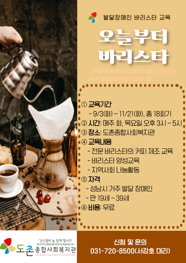[광성일보] 성남도촌종합사회복지관(관장 이종민)은 8월 16일까지 청년 발달 장애인 바리스타 교육인 ‘오늘부터 바리스타’의 참여자를 모집한다. 성남도촌종합사회복지관은 재단법인 여의도순복음연합(여의도순복음분당교회)에서 성남시로부터 위탁 운영하는 사회복지관으로서, 틈새 취약계층 등 우리 사회 힘든 분들을 돕는 일을 전문으로 하는 비영리 사회복지실천기관이다.