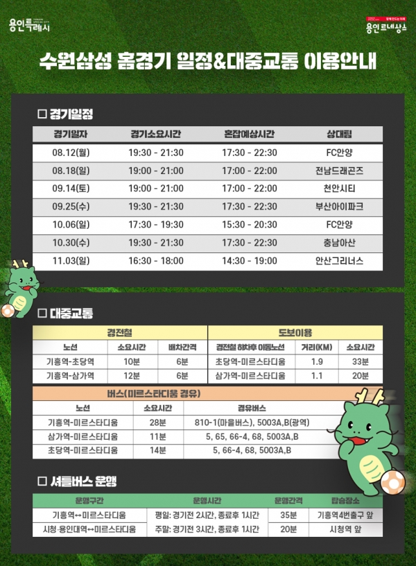 시내버스, 마을버스, 광역버스 등의 대중교통을 이용하는 관람객은 5, 65, 68, 66-4, 810-1, 5003A‧B 등 7개 노선을 이용하면 된다. 이 버스를 타고 인근 주차장에서 하차하면 도보로 5분 내로 용인미르스타디움에 도착한다.시 관계자는 “안전하고 쾌적한 경기 관람을 위해 가급적 대중교통을 이용해 주시길 부탁드리며, 경기가 있는 날 퇴근 시간과 겹쳐 교통혼잡이 예상되는 만큼 용인미르스타디움을 경유하는 일반 차량은 우회해 주시길 바란다”고 당부했다.한편, 수원 삼성 홈경기는 8월 12일(월), 8월 18(일), 9월 14일(토), 9월25일(수), 10월 6일(일), 10월 30일(수), 11월 3일(일) 총 7차례에 걸쳐 열릴 예정이다.