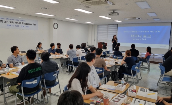 [광성일보] 성남도시개발공사(사장 박민우, 이하 공사)는 지난 7일 조직문화 개선을 위한 ‘하모니 토크(Harmony Talk)’ 교육을 운영했다고 8일 밝혔다.‘하모니 토크’는 소통·협력하는 조직문화 조성 및 성과 창출을 위해 마련된 자리로, 상호이해 증진을 바탕으로 부서·직종·계층·세대 간 갈등을 해소하고자 기획됐다.