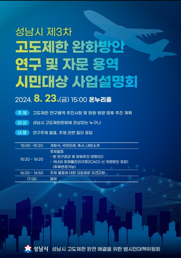 성남시는 오는 23일 오후 3시 성남시청 온누리홀에서 ‘성남시 제3차 고도제한 완화방안 연구 및 자문용역 시민대상 사업설명회’를 개최한다.