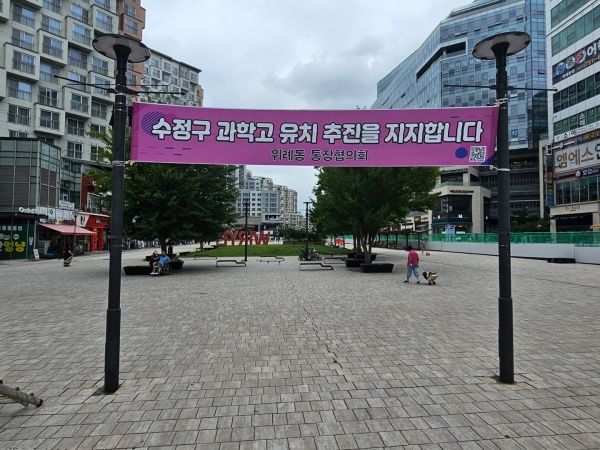 또한 수정구 위례 일대에는 포스코 통합연구소, 현대차 연구소 등 국내 최고 수준의 4차 산업 관련 연구소가 들어설 예정이라며, "수정구 내 대학 4곳과 과학고가 연계해 미래 핵심 산업을 이끌 차세대 인재를 육성할 수 있을 것"이라고 덧붙였다.주민들의 호응도 뜨겁다.수정구 위례동에서는 모든 아파트 단지와 유관 단체들이 과학고 유치를 지지하는 현수막을 내걸고 있으며, 이 열기가 수정구 전역으로 확산되고 있다.