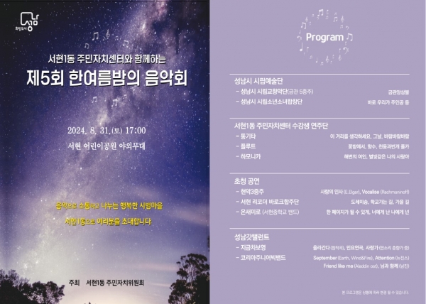 성남시 분당구 서현1동 주민자치센터와 함께하는 ‘제5회 한여름밤의 음악회’가 8월 31일 오후 5시 서현어린이공원 야외무대에서 열린다.