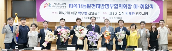 [광성일보] 방세환 광주시장은 30일 서울 여의도 국회의원 회관에서 지속가능발전 지방정부협의회 제8대 협의회장으로 취임했다.취임식에는 4년 동안 지속가능발전 지방정부협의회를 이끌어온 제6‧7대 박우량 신안군수가 이임하고 방 시장이 신임 협의회장으로 취임했다.이에 앞서 방 시장은 ‘2024년 지속가능발전 지방정부협의회 상반기 정기회의’에서 제8대 협의회장으로 선출됐다.이날 행사는 제6‧7대 협의회장 성과 보고, 제8대 협의회장 추대, 이임 회장 공로패 전달, 이‧취임사, 기념 촬영 순으로 진행됐다.