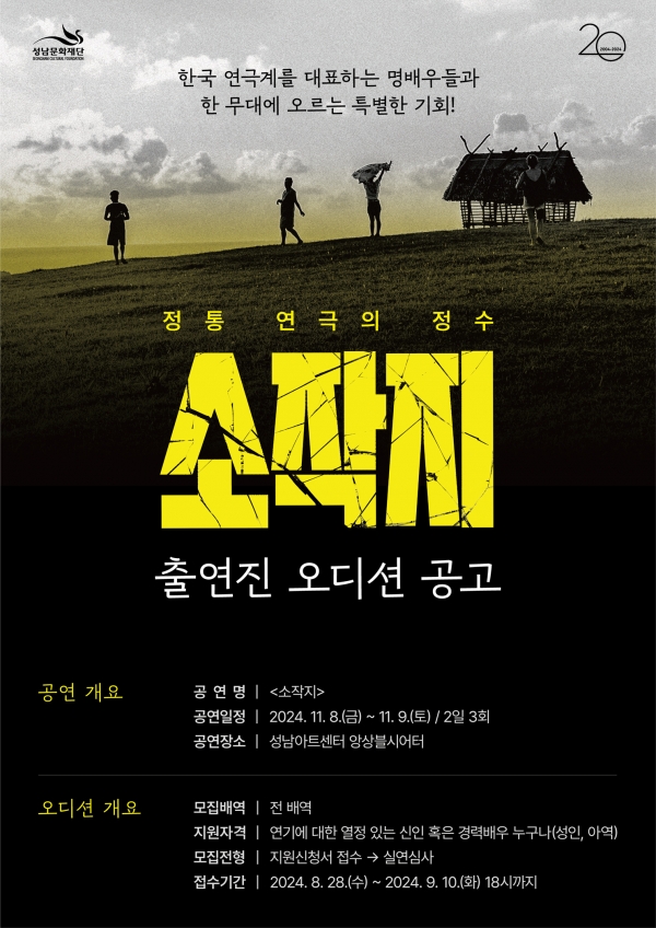 [광성일보] 성남문화재단(대표이사 서정림)이 연극계 원로 배우들과 성남예술인이 함께하는 제작공연 <소작지>에 출연할 역량 있는 배우를 오는 9월 10일(화)까지 공개 모집한다.성남문화재단과 원로연극인들의 모임인 ‘대학로 연극인 광장‘이 공동 제작하는 연극 <소작지>는 1920년대 일제의 수탈로 참혹한 현실을 살아야 했던 가난한 소작농들의 애환과 농촌의 전통적 질서와 정서를 지키려는 사람들의 삶을 다룬 작품이다.