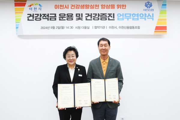 [광성일보] 이천시(시장 김경희)는 9월 2일 이천신용협동조합(이사장 전찬구)과 이천시 건강생활실천 향상을 위한 건강적금 운용 업무협약을 체결하였다고 전했다.시는 최근 건강에 대한 시민들의 관심이 커지며 보건소의 다양한 건강증진 서비스에 대한 요구도 많아짐에 따라, 시민의 건강 문제를 개선하고 건강을 증진하기 위한 대안을 여러모로 모색하고 있으며, 이것의 한 가지로 업무협약을 진행하게 되었다고 밝혔다.