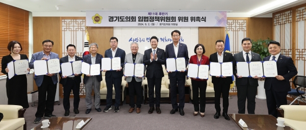 김 의장은 각 위원에게 위촉장을 수여하고 “고도화된 입법 활동을 통해 자치입법권 확대를 이끌어야 한다”라며 “위원들이 든든한 자문과 조언의 역할을 해주길 기대한다”라고 당부했다이어 “입법정책위원회가 경기도의회의 입법 역량을 한층 강화하고, 도민의 삶에 실질적인 변화를 가져올 수 있는 정책을 만들어 가는 데 중요한 역할을 하길 바란다”라고 덧붙였다.제11대 후반기 입법정책위원회는 위촉식 직후 중회의실에서 첫 회의를 열어 조희선 의원과 김보람 위원을 각각 위원장과 부위원장으로 선출했다.