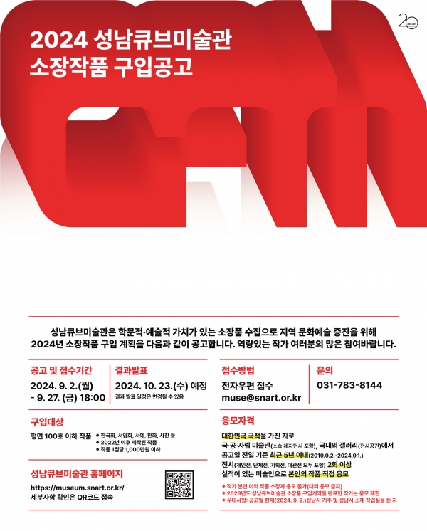 이번 소장품 구입은 2022년 이후 제작된 100호 이하, 작품가격 1천만 원 이하의 평면작품(한국화, 서양화, 서예, 판화, 사진 등)을 대상으로 하며, 공고일 전일 기준 최근 5년 이내에 2회 이상 전시 개최 실적이 있는 국내 작가면 누구나 응모할 수 있다. 특히 지역 미술인의 창작활동 지원과 지역 미술 문화 활성화를 위해 성남시 거주 및 성남시에 작업실을 둔 작가에게는 5%의 가산점을 부여한다. 매도를 희망하는 작가는 성남문화재단 홈페이지(www.snart.or.kr)에서 신청 양식을 내려받아 전자우편(muse@snart.or.kr)으로 접수하면 된다.접수된 작품들은 성남문화재단의 소장품 관련 규정에 따라 외부 전문가로 구성된 소장작품선정위원회와 가격평가심의위원회의 심의 및 평가를 거쳐 소장 작품으로의 적정성과 예술적 가치, 가격 등을 심사해 최종 결정된다. 선정 결과는 오는 10월 23일(수) 성남문화재단, 성남큐브미술관 홈페이지를 통해 확인할 수 있다.