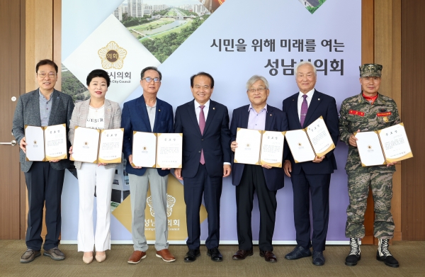 [광성일보] 성남시의회(의장 이덕수)는 5일 오전‘국민운동단체 간담회’를 개최했다. 이 자리에서 이덕수 의장은 방영기 성남시 새마을회장, 백정순 바르게살기운동 성남시협의회장, 박성환 한국자유총연맹 성남시지회장, 우건식 성남시 재향군인회장, 염덕길 성남시 재향경우회장, 김명섭 성남시 해병대전우회장에게 각각 공로장을 수여했다.