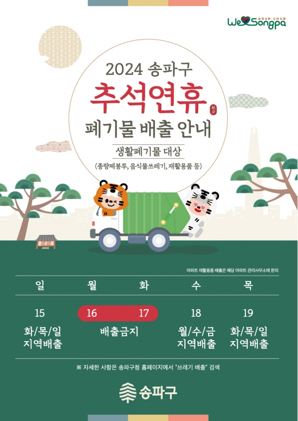 송파구(구청장 서강석)가 9월 9일부터 19일까지 추석 연휴 기간 쓰레기 배출 안내와 지역 대청소 등 청소종합대책을 추진한다.