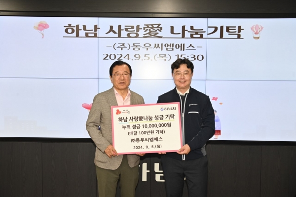[광성일보]  ㈜동우씨엠에스는 23년 11월부터 하남 사랑愛 나눔 성금으로 매달 100만원씩 기탁하며, 24년 8월 누적 성금 1천만원 달성을 기념하기 위해 기탁식을 가졌다.이날 기탁식에는 이현재 하남시장을 비롯해 ㈜동우씨엠에스 신동주 대표, 신의연 상무이사, 김대기 부장, 김동학 차장, 김기욱 차장, 이준영 과장, 윤영빈 대리, 최종원 대리, 조정원 주임, 이민형 사원 등 임직원 10명이 참석하여 자리를 빛냈다.
