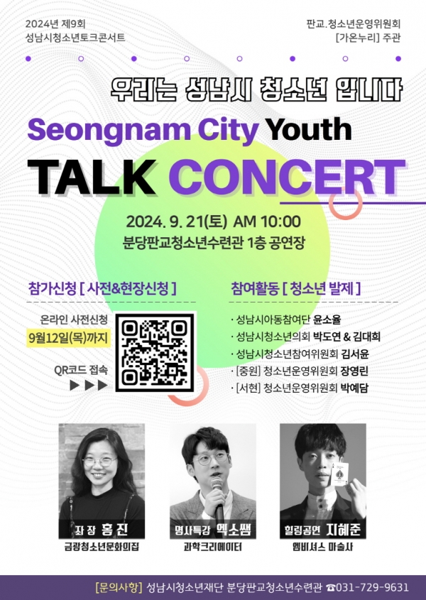 특히, 성남시 및 성남시청소년재단 내 시설별 참여기구가 함께 협력하여 청소년의 참여활동에 대한 소통과 공론의 장으로 운영될 예정이다.제9회 성남시청소년토크콘서트에 참여하고 싶은 청소년은 9월 12일까지 포스터의 QR코드를 통해 신청할 수 있고, 행사 당일 현장접수도 가능하다. 자세한 사항은 성남시청소년재단 홈페이지에서 확인할 수 있다.