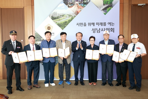 성남시의회(의장 이덕수)는 11일 오전‘성남시 보훈단체장 간담회’를 개최하며 그들의 헌신에 대한 감사의 의미로 공로장을 전달했다.