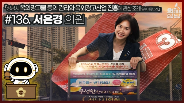 [광성일보] 성남시의회는 ‘3분 조례-서은경 의원 편’ 영상을 시의회 공식 SNS에 게시했다.이번에 소개된 조례는 서은경 의원 등 19명이 발의한 ‘성남시 옥외광고물 등의 관리와 옥외광고산업 진흥에 관한 조례 일부개정조례’다.