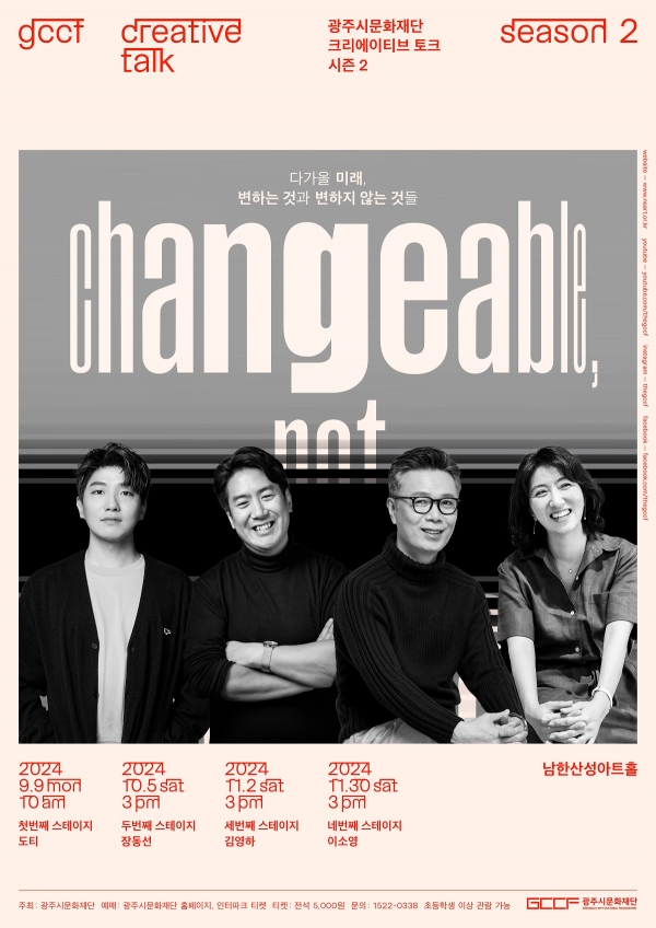 이번 강연을 시작으로 10월 5일 뇌과학자 장동선 교수, 11월 2일 김영하 작가, 11월 30일 마이크로소프트 이소영 이사의 강연이 남한산성아트홀에서 진행될 예정이다.○ <크리에이티브 토크 시즌 2> 티켓은 전석 5,000원이며 광주시문화재단 홈페이지(www.nsart.or.kr)와 인터파크 티켓(www.ticket.interpart.com)을 통해 9월 19일부터 예매가 가능하다.