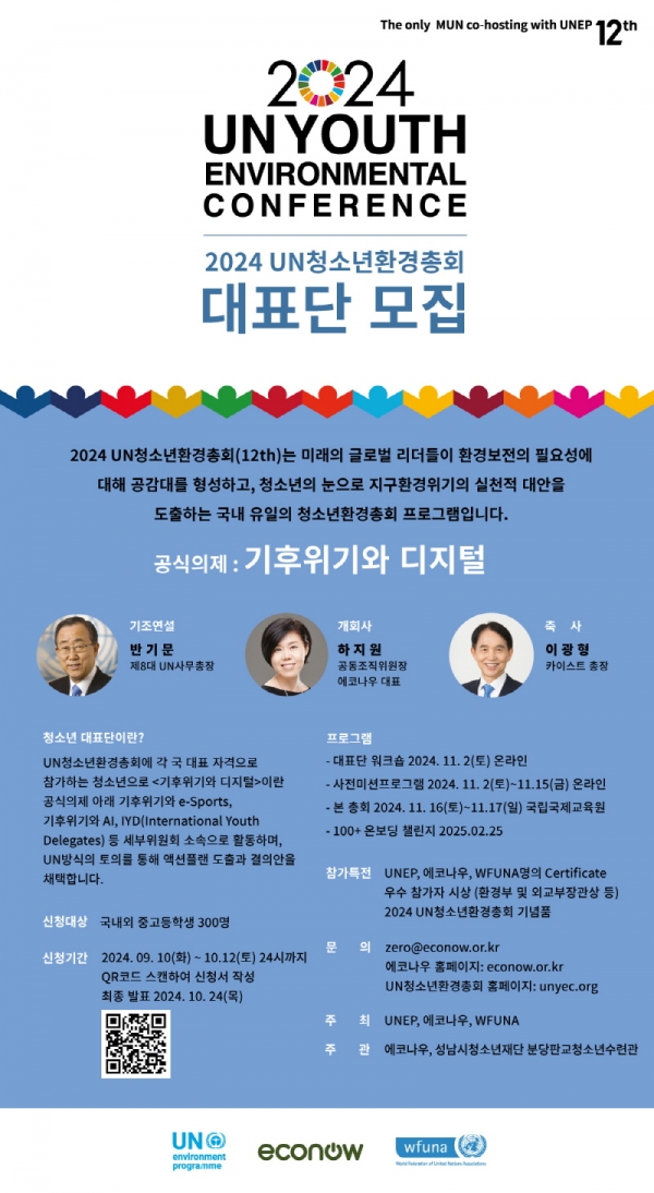 [광성일보] 성남시청소년재단 분당판교청소년수련관(관장 정은옥)과 (사)에코나우(대표 하지원)는 11월 16일부터 17일까지 국립국제교육원에서 개최되는 제12회 UN청소년환경총회의 청소년 대표단을 모집한다.UN청소년환경총회는 분당판교청소년수련관과 사단법인 에코나우가 공동 주관하여 미래 세대 글로벌 리더들이 한자리에 모여 모의로 유엔총회를 경험하고, 전 세계적인 지구환경 위기를 해결하기 위한 실천적 대안을 도출하는 행사다.