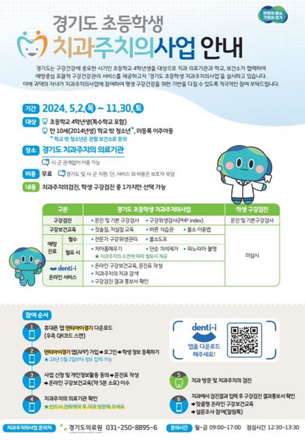 시는 예방 중심의 포괄적 구강건강관리 서비스 제공을 위해 1인당 4만 8천원의 검진비를 지원한다.사업 참여 희망자는 ‘덴티아이경기’ 앱을 내려받아 문진표 작성 및 온라인 교육을 이수한 후 사업 참여 중인 치과로 전화해 검진 일정을 예약하면 된다.해당 사업은 올해 11월 말까지 추진되며 학교 밖 청소년이나 미등록 이주 아동은 관할 보건소로 문의하면 참여방법을 안내받을 수 있다.박강용 하남시보건소장은 “초등학교 4학년 무렵은 평생 구강건강의 기틀을 만들 수 있는 중요한 시기로, 보다 많은 학생들이 참여하길 바란다”라며 “앞으로 다양한 구강보건 서비스를 통해 취학아동들의 구강건강증진에 최선을 다하겠다”라고 말했다.한편, ‘경기도 초등학생 치과주치의사업’과 관련한 자세한 사항은 하남시보건소 건강증진과(☎031-790-5098)로 문의하면 된다.
