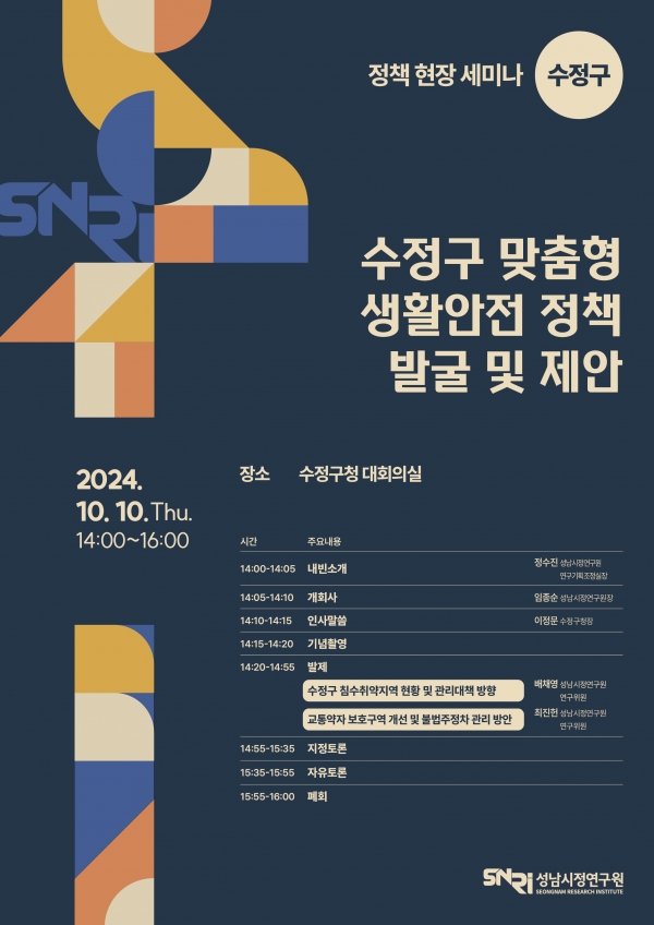 성남시정연구원이 오는 10일 오후 2시, 수정구청 대회의실에서 정책 현장 세미나를 개최한다.