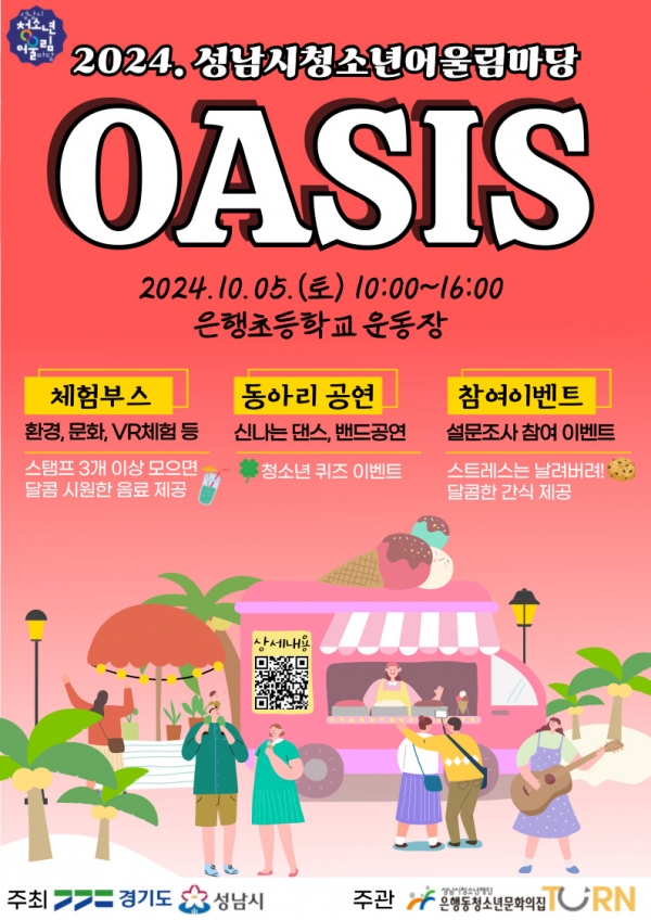 [광성일보] 성남시청소년재단 은행동청소년문화의집(관장 박관순)은 오는 5일 오전 10시부터 오후 4시까지, 은행초등학교 운동장에서 청소년어울림마당‘오아시스’를 개최한다.청소년어울림마당 ‘오아시스’는 제15회 은행골축제와 함께 열리며, 청소년들이 다양한 문화 활동의 주체로서 능동적으로 참여할 수 있는 장을 마련하는 데 목적을 두고 있다.
