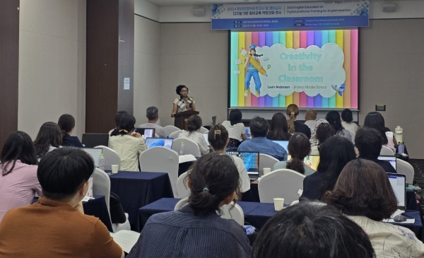 연수는 진주교육대학교 권서경 교수의 ▲디지털 시대의 영어교육 방법 ▲패들렛, 챗지피티(CHAT GPT), 캔바, 디지털 영어 교과서 ▲ 타지아 활용 어휘 게임, 메타버스 활용 영어독서활동 ▲니어팟 활용 학생소통형 영어수업 설계 ▲영어수업 사례 나눔 등 다양한 주제로 운영된다.이번 연수는 모두 영어로 진행되며 교사들 모두 영어로 소통하며 디지털 역량과 영어 의사소통역량도 높일 수 있다.오전에는 디지털 시대 영어교육의 바람직한 방향과 디지털 기반 학생맞춤형 영어학습부진아 지도 방법을 고민하고, 원어민 교사들이 창의성을 신장하는 다양한 영어 수업 방법을 공유한다.
