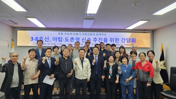 [광성일보]  성남시의회에서 지하철 3·8호선 연장 사업과 야탑·도촌역 신설 추진을 중점으로 성남시 철도사업과 관련하여 주민들의 의견을 듣는 간담회가 열렸다. 이번 간담회는 이광재 분당갑 지역위원장이 주최했으며, 성남시 교통인프라가 신속하게 구축될 수 있는 방안을 모색하기 위해 마련되었다.특히, 이번 간담회에는 국토교통위원회 위원인 전용기 국회의원이 함께 참석해 그 의미를 더했다.