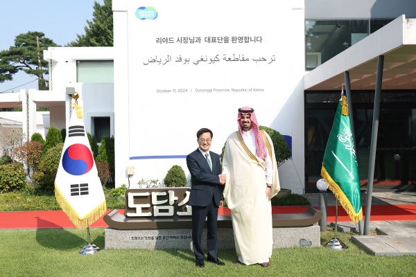 [광성일보] 김동연 경기도지사가 사우디아라비아의 수도 리야드 파이살 빈 에야프(Faisal bin Ayyaf) 시장과 만나 경기도와 리야드시의 협력관계를 위한 물꼬를 텄다.김동연 지사는 11일 오전 도담소에서 파이살 빈 에야프 사우디아라비아 리야드 시장과 경기도-리야드시 간 기후위기, 대중교통 관리, 도시계획 협력에 대해 의견을 교환했다.김동연 지사는 리야드 시장에게 참여정부 시절 경제부총리로서 주도해 작성한 ‘비전2030’과 경기도의 기후정책에 대해 자세히 설명했다.김 지사는 “20년 전에 대한민국의 ‘비전2030’을 만든 주역으로서 ‘사우디 비전2030’ 얘기를 듣고 아주 반가웠다. 성공적으로 실천하시기를 기대한다”면서 “경기도는 대한민국의 모든 산업과 경제의 중심으로 리야드시가 원하는 도시 발전에 필요한 모든 것들을 갖고 있다. 리야드시, 사우디아라비아와 경기도와의 관계가 한층 더 강화되기를 기대한다”고 말했다.