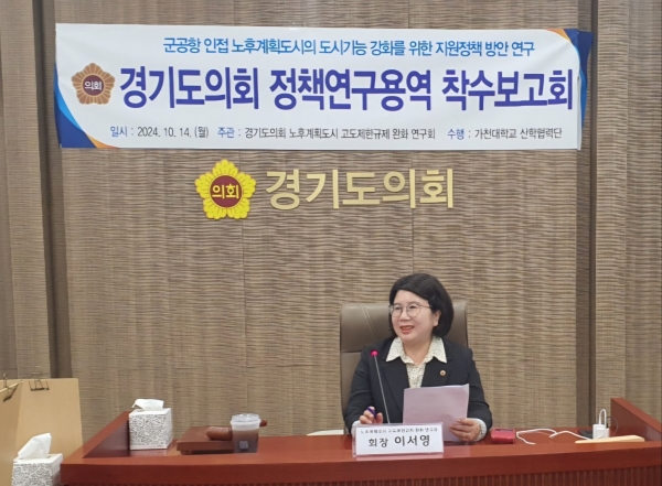 이에 이서영 의원은 고도제한 규제 지역에 대한 지원책을 마련, 다른 지역과 함께 정비사업을 추진함으로써 도시기능을 강화할 필요가 있다고 판단해 이번 연구과제를 진행하게 됐다.이번 연구과제는 이서영 의원이 회장을 맡고 있는 ‘노후계획도시 고도제한규제 완화 연구회’에서 제안했으며, 수의계약을 통해 수행업체로 선정된 ‘가천대학교산학협력단’ 김희철 교수(가천대학교)가 책임연구원을 맡아 연구를 진행할 예정이다.이날 착수보고회는 회장인 이서영 의원을 비롯해 경기도의회 김규창 부의장, 김호겸 의원, 임상오 의원, 이애형 의원, 장한별 의원, 최승용 의원, 이기환 의의원, 교육행정전문위원실에서 전은경 수석전문위원, 김창호 팀장, 김영민 팀장, 경기도청 노후신도시정비과에서 임규원 과장, 조영선 팀장, 김규원 주무관 등 14명이 참석한 가운데 김희철 교수가 △과업의 이해 △민간 및 군공항 관련 지원 정책 사례 △군공항 인접 노후계획도시 지역 분포 △공항 도시 및 공항 활용 도시개발 국내외 사례 등에 대해 보고하고 참석자들의 질의응답 순으로 진행됐다.