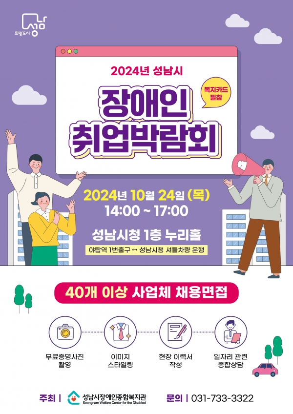 [광성일보] 성남시장애인종합복지관(관장 한창경)은 2024년 10월 24일(목) 성남시청 1층 누리홀에서 ‘2024년 성남시장애인취업박람회’를 개최한다. 엔씨소프트, 주식회사 포스코휴먼스, KTIS, 이케아코리아유한회사, 맥도날드 등 41개 사업체와 구직자 1,000여명이 참여하는 ‘성남시장애인취업박람회’에서 생산직, 사무직, 서비스직 등 다양한 직종의 110여명의 장애인이 채용될 것을 기대하고 있다.