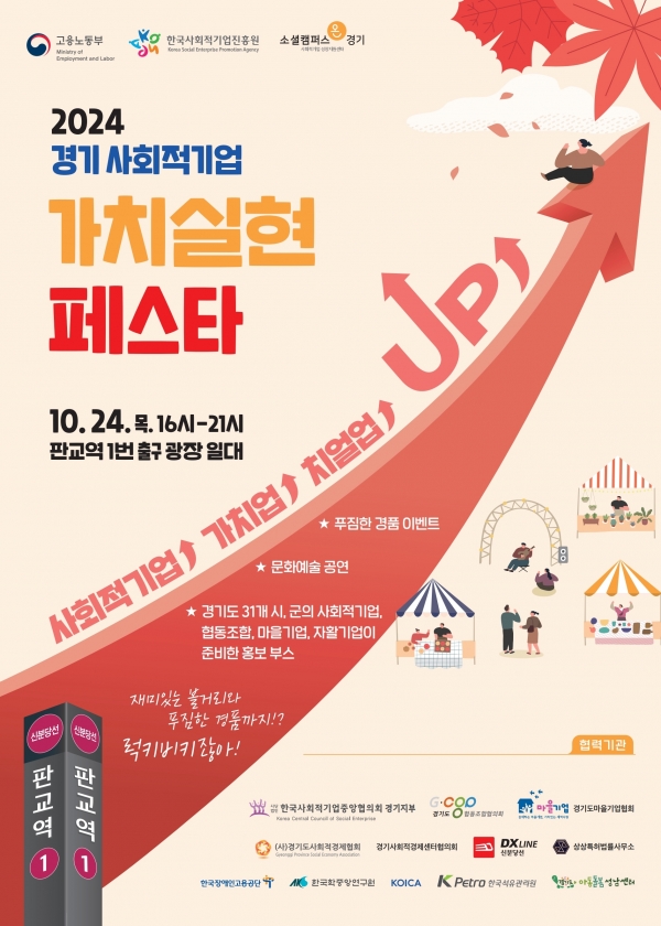 ‘사회적기UP, 가치UP, 치얼UP’을 주제로 열린 이번 페스타에는 △한국사회적기업중앙협의회 경기지부 △경기도협동조합협의회 △경기도마을기업협회 △경기도사회적경제협회 △경기사회적경제센터협의회 △경기도아동돌봄성남센터 △DXLINE신분당선 △상상특허법률사무소 △한국장애인고용공단 △한국학중앙연구원 △KOICA △한국석유관리원 등이 협력기관으로 참여한다.‘소셜캠퍼스 온 경기’ 관계자는 "경기도 사회적기업, 협동조합의 다양한 제품과 서비스를 접할 수 있는 이번 페스타에 많은 관심 바란다"고 전했다.한편, 사회적기업 성장지원센터인 ‘소셜캠퍼스 온 경기’는 고용노동부 산하기관인 한국사회적기업진흥원에서 운영하는 사회적기업 성장지원센터로 경기지역 사회적기업, 협동조합 등에 대한 지원과 행정 업무 전반을 수행하고 있다.