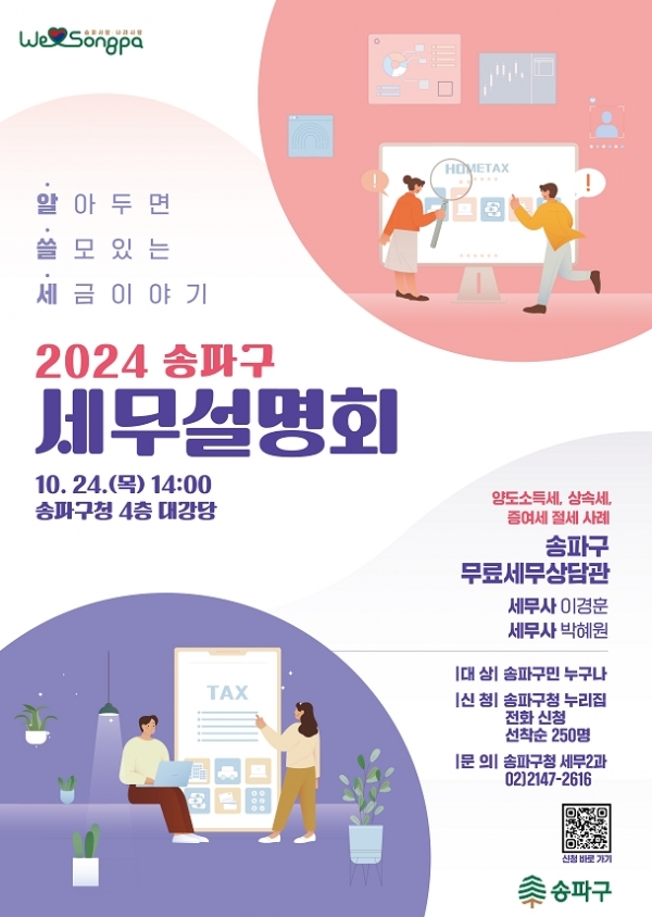 송파구(구청장 서강석)는 부동산 시장과 조세정책 영향이 큰 지역 특성을 반영해 오는 10월 24일 송파구청 4층 대강당에서 ‘2024 송파구 세무 설명회’를 개최한다.